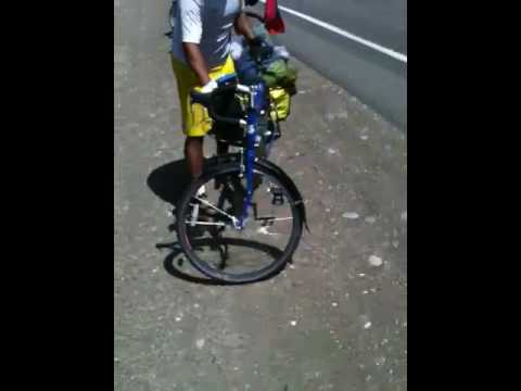 Righting the bikes with trailers is hard, but Camilo has developed a grunt to assist him.